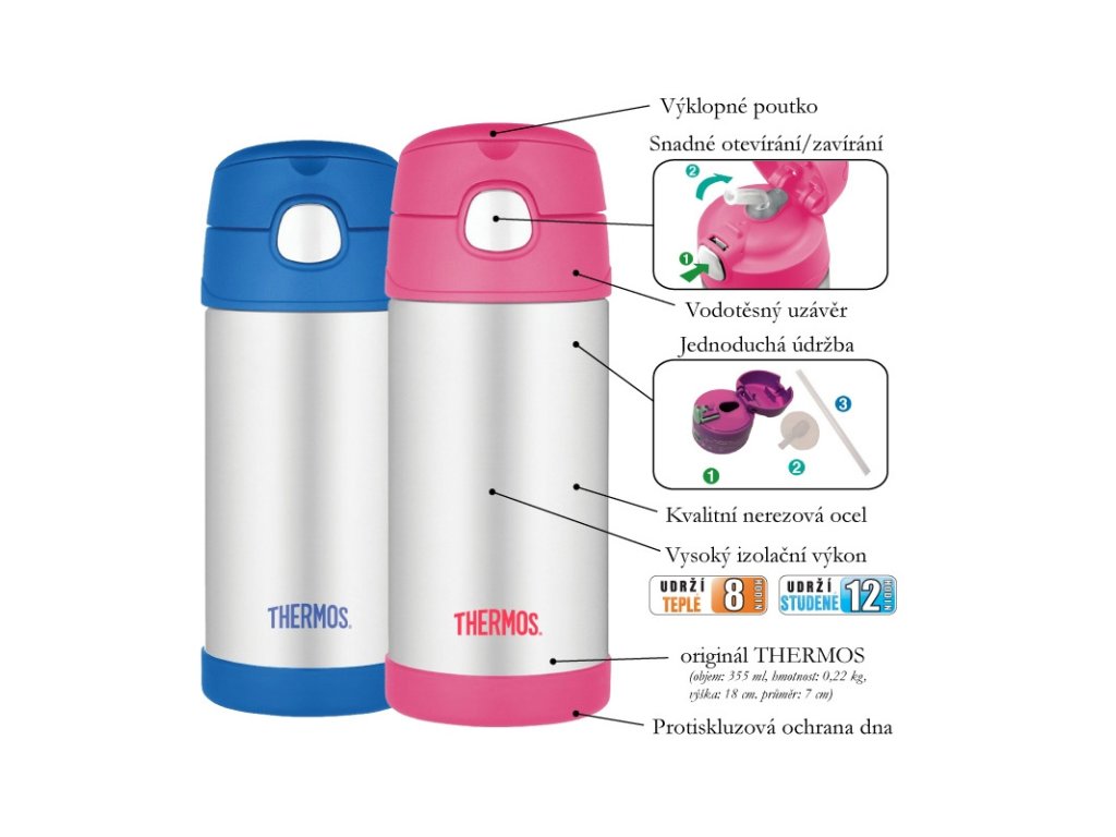 Teplé a studené nápoje se pijí přímo z termosky - bez nalévání do šálku. Nápoj se pije pomocí brčka - není nutné naklánět termosku.