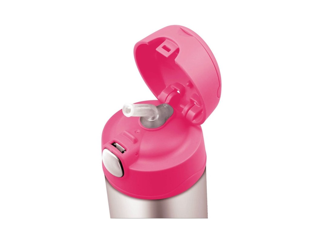 Otevření termosky je velmi rychlé a snadné. Děti otevřou i zavřou termosku samy bez pomocí rodičů. Postup: 1 - zmáčknutí tlačítka, 2 - víčko termosky se samo otevře.